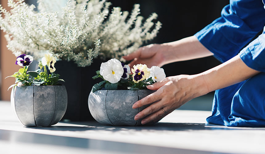 Pansies bloom in beautiful pots. Natural mixed plantings add colour to everyday life. (Pictured: size M)