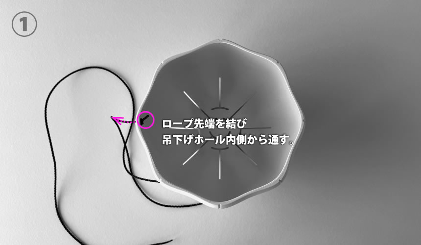 ロープ先端を結び吊下げホール内側から通す。