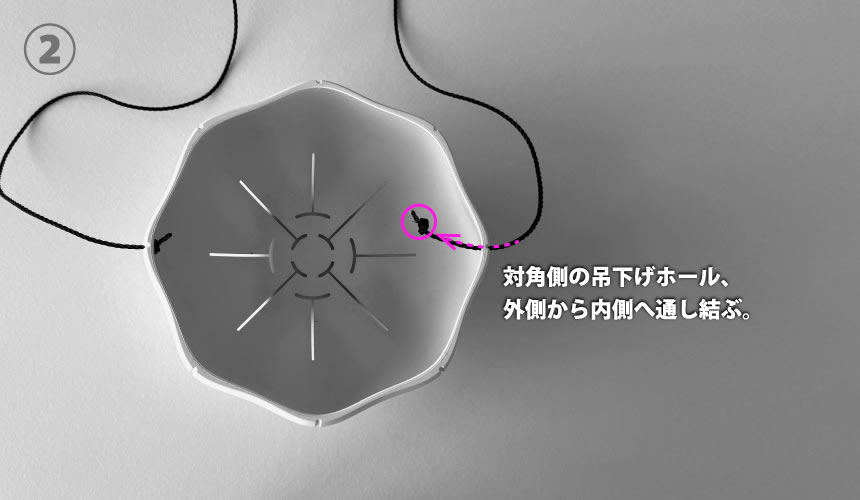 残りの吊下げホール2箇所も同様、①、②の手順で通し、結ぶ。